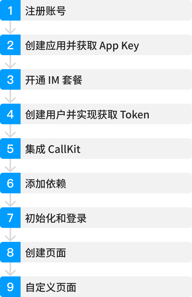 | 创建应用 获取 App Key | 1. 要接入即时通讯 IM 服务,你必须首先在环信控制台 创建应用。 2. 环信会给创建的应用分配 App Key,作为应用的唯一标识。你需要 获取应用的 App Key,集成 SDK 时传入 App Key。 |
